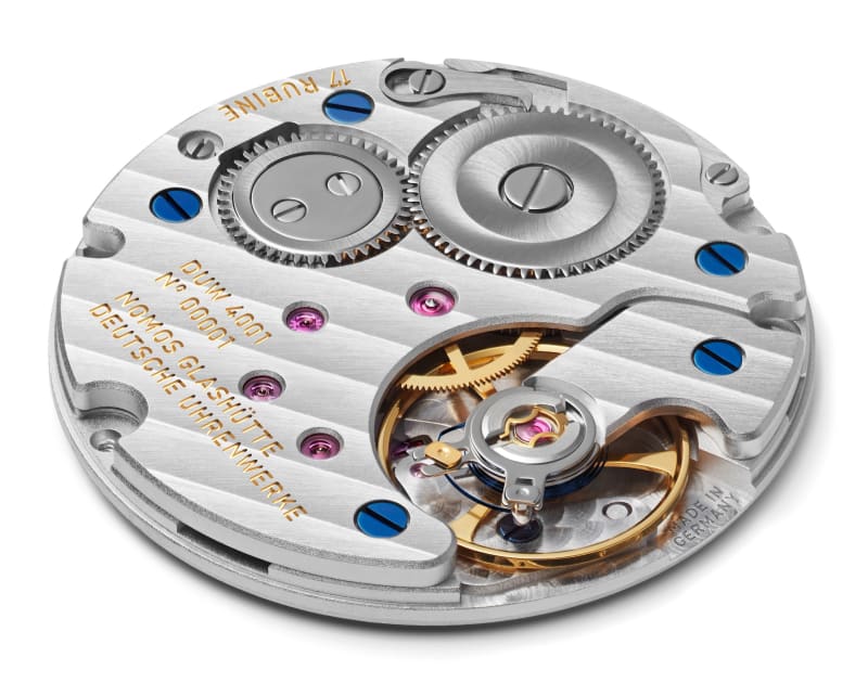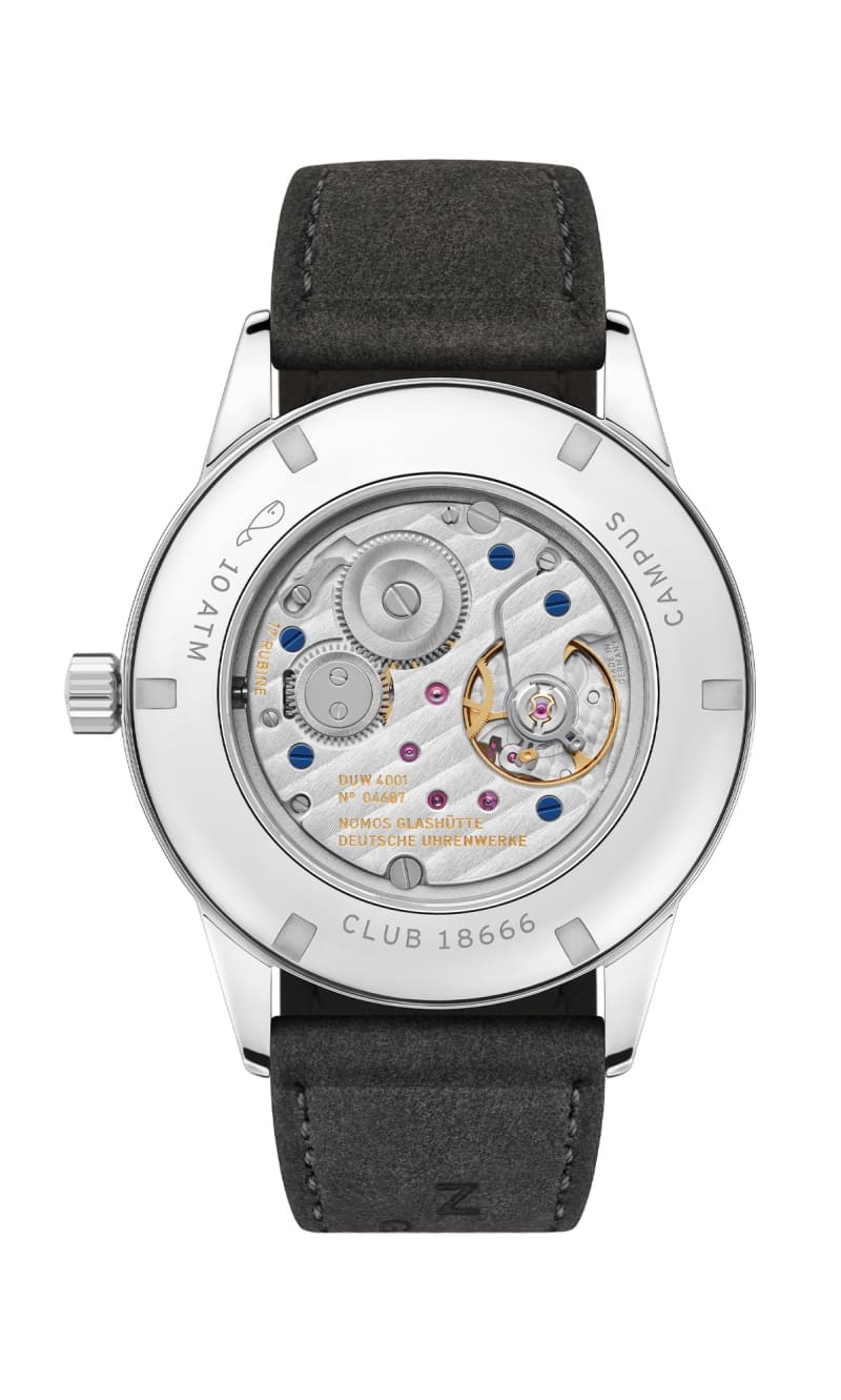 The case is polished stainless steel, available in 38.5mm or 36mm, with a domed sapphire crystal and an option for a display or solid back. Water resistance is rated at 100 meters. Inside is the NOMOS in-house caliber DUW 4001, a manual-wind movement with a 53-hour power reserve. It features the NOMOS swing system and Glashütte three-quarter plate—details collectors will recognize.