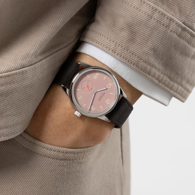 The dials mix Arabic and Roman numerals with SuperLuminova for visibility. Rhodium-plated hands also get the lume treatment, while the seconds hand stands out in neon orange. The watch comes on a vegan velour strap in anthracite.
