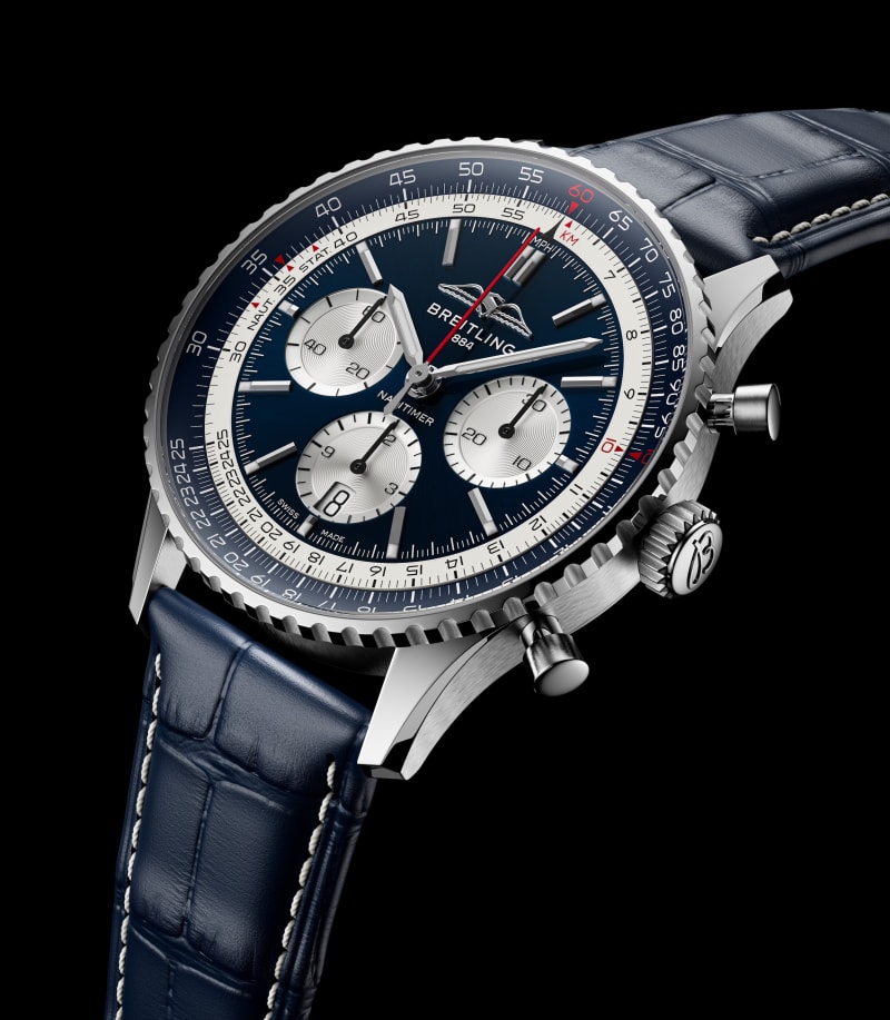 The Navitimer B01 Chronograph 43 Tribute to Concorde features a blue dial reminiscent of the stratosphere, matched with a blue alligator strap. The white accents on the dial nod to Concorde's "White Bird" nickname. Limited to 593 pieces, this number pays homage to the Olympus 593 engines that powered the aircraft. The caseback engravings remind you of its supersonic legacy: "One of 593," "Tribute to Concorde," "Jetliner," and "Mach 2."