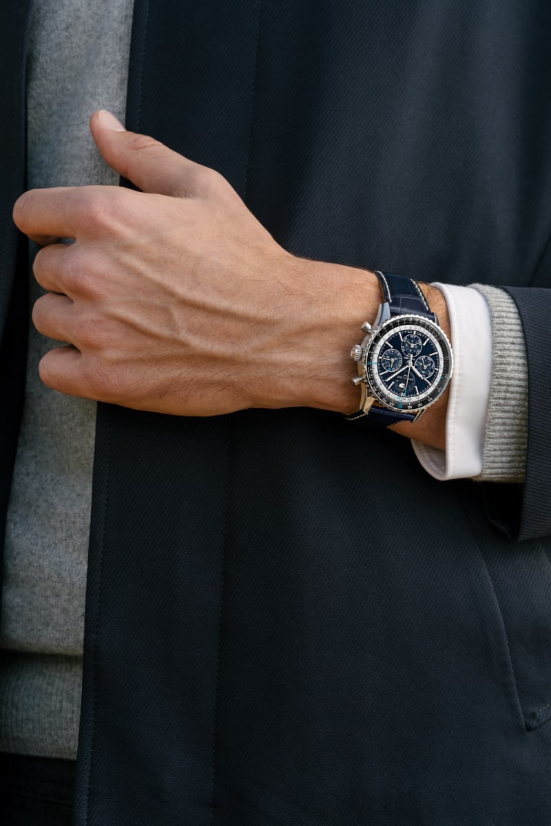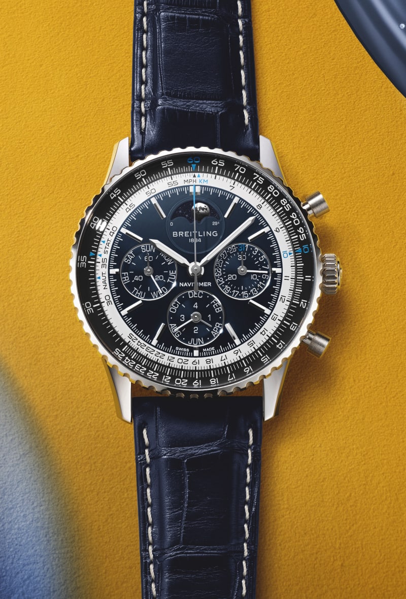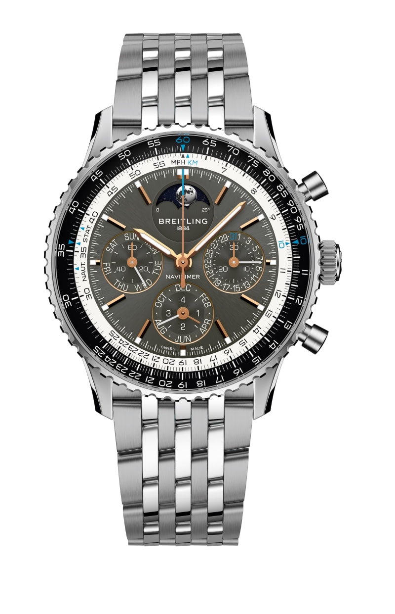 The case measures 43mm by 49mm and is available in stainless steel or platinum. It features a cambered AR-coated sapphire crystal and a sapphire display back, with water resistance up to 30 meters. Both versions sport a bi-directional platinum bezel with a circular slide rule—classic Navitimer.