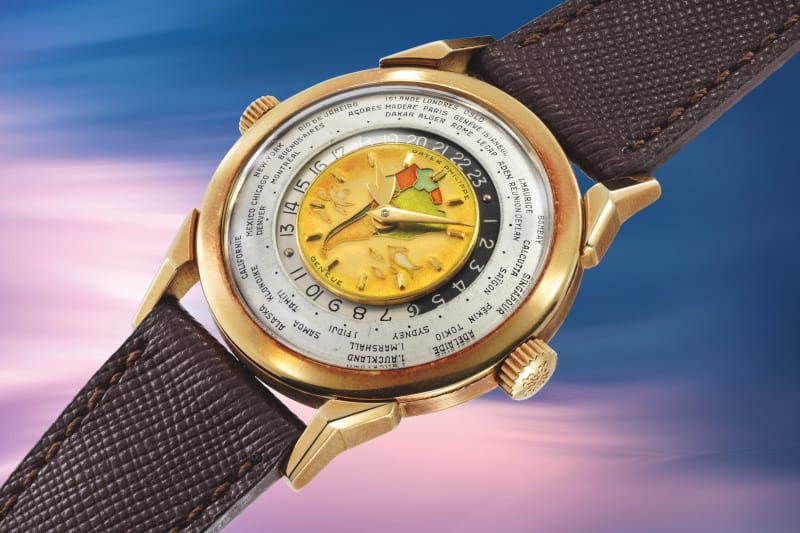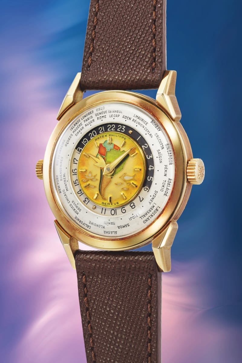 This is the Ref. 2523 with a polychrome cloisonné enamel dial featuring South America. Made in 1953, it's one of only two known in yellow gold and the only one ever offered at public auction. Estimated to exceed 5,000,000 Swiss Francs, it will be Lot 27 at the Phillips Geneva Watch Auction: XXIII this May.