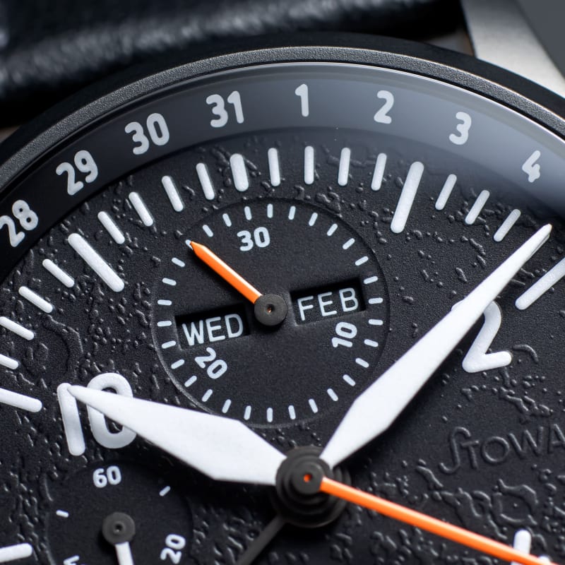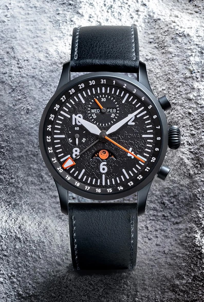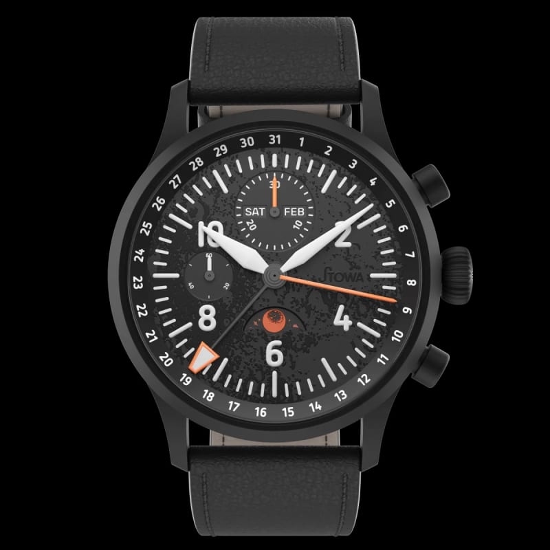 The dial is textured 3D black with SuperLuminova white hands and indices. Arabic numerals keep it readable. The orange SuperLuminova "blood" moon adds a splash of color that’s hard to miss.